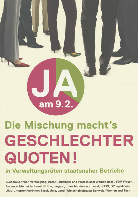 Ja: frauenrechte beider Basel, VPOD, Akademikerinnen Vereinigung, Business and Professional Women Basel, Wirtschaftsfrauen Schweiz Nein: Komitee gegen Geschlechterquoten; HKBB, Arbeitgeberverband |