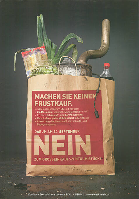 | Beschreibung der Vorlage | Der Grossratsbeschluss betraf den Bebauungsplan für ein neues Einkaufszentrum, das grösste der Nordwestschweiz, auf dem ehemaligen Industrieareal der Stückfärberei («Stücki») in Kleinhüningen. Zum Shopping hinzu kamen ein Hotel, Büros und Freizeiteinrichtungen. Der Bebauungsplan begrenzte die Parkplätze auf 825, zudem wurde mit einem Fahrtenmodell die Anzahl der erlaubten Ein- und Ausfahrten begrenzt. Die Opposition galt trotzdem primär dem motorisierten Mehrverkehr. |