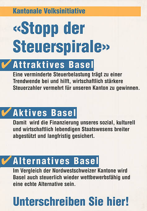 Die Volksinitiative verlangte eine Reduktion der Einkommens- und Vermögenssteuer und eine Erhöhung des Kinderabzugs um 1000 auf 6000 Franken. Der Maximalsteuersatz für Einkommen ab 1,25 bzw. 2 Millionen Franken sollte neu 27,5 statt 29 % betragen. Die Mindereinnahmen für die Steuerkasse wurden auf 106 Millionen Franken pro Jahr geschätzt. Die Stimmberechtigten nahmen den Gegenvorschlag an.