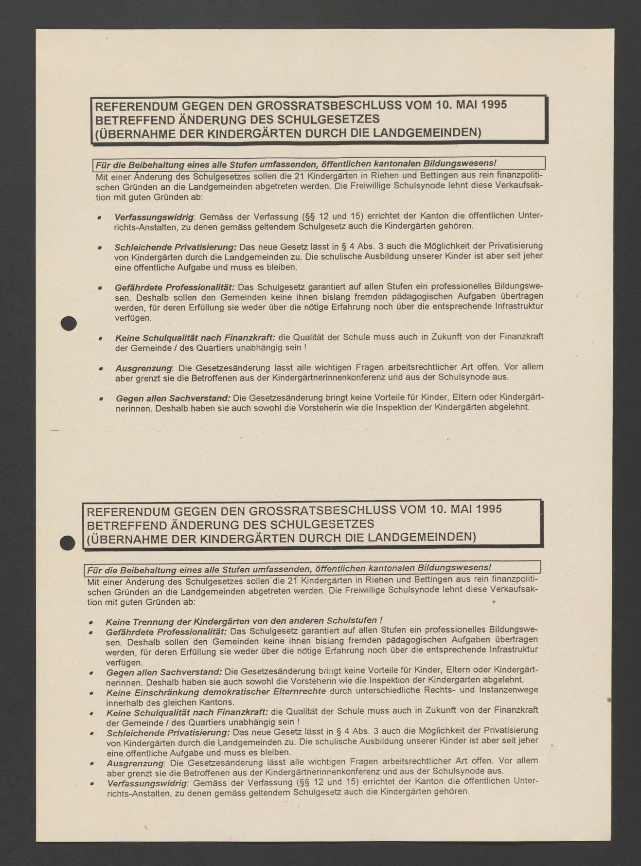 | Beschreibung der Vorlage | Mit der Änderung des Schulgesetzes übertrug der Kanton den Einwohnergemeinden Riehen und Bettingen gegen deren Willen die Organisation und den Betrieb der Kindergärten. Der Kanton begründete dies damit, dass Kindergärten eine typische Gemeindeaufgabe seien, er entlastete sich finanziell aber auch um jährlich 2,8 Millionen Franken. Die Oberaufsicht blieb beim Erziehungsdepartement. Die Gegnerschaft aus Schulkreisen befürchtete eine Abkoppelung der Kindergärten der Landgemeinden vom Kanton und damit einen Qualitätsverlust. Auch die Stimmberechtigten der Landgemeinden lehnten die Vorlage mehrheitlich ab. |