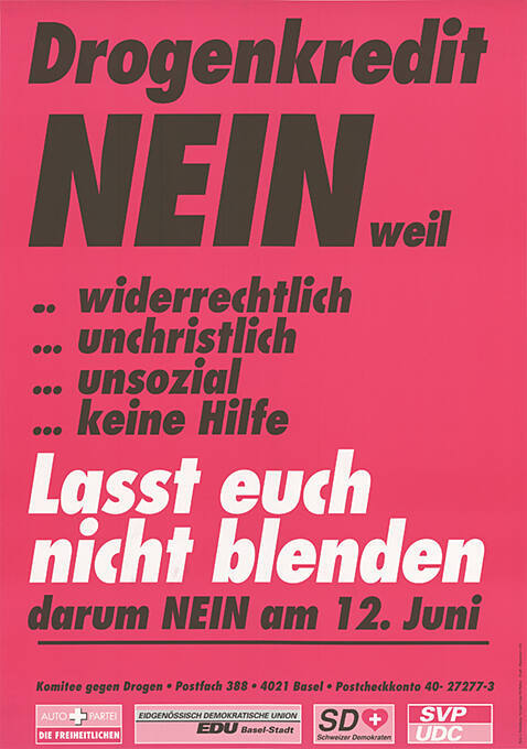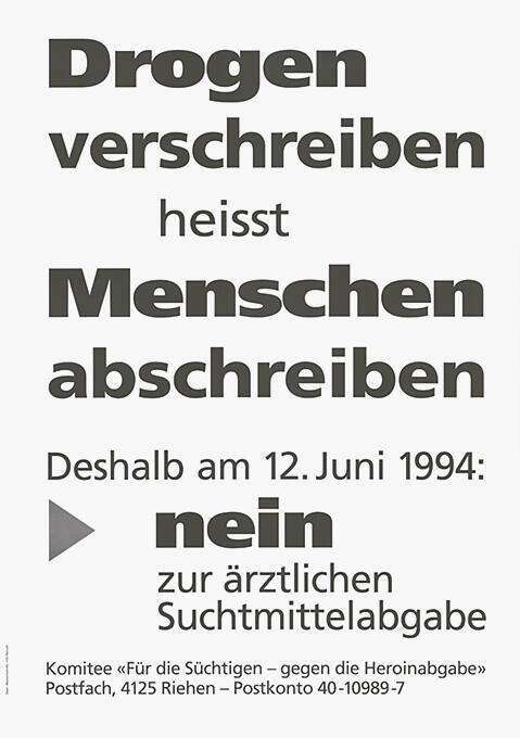 Ja: Komitee «Versuch ärztliche Opiatabgabe Ja» Nein: Komitee «Für die Süchtigen - gegen die Heroinabgabe» |