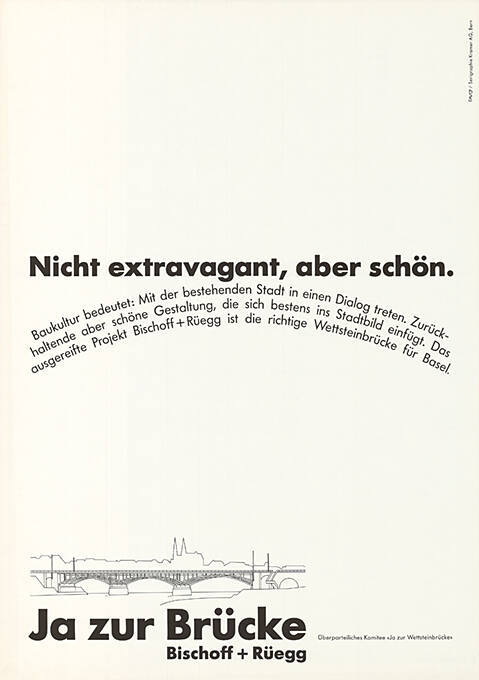 | Beschreibung der Vorlage | Der vom Grossen Rat dem obligatorischen Referendum unterstellte Beschluss betraf eine Ausgabe von 44,3 Millionen Franken für den Bau einer neuen Wettsteinbrücke. Es handelte sich um das Projekt von Bischoff+Rüegg, welches Expertenkommission und Regierungsrat empfohlen hatten. Der Abstimmungskampf drehte sich um die Frage, wieviel der Stadt eine besondere Brücke wert ist. Das Projekt Bischoff+Rüegg galt als schlicht und günstig. Das von einer privaten Gruppe eingebrachte Projekt des spanischen Architekten Calatrava wurde von manchen als ästhetischer empfunden, die Gegner zogen aber ihre Machbarkeit in Zweifel und warnten vor explodierenden Kosten. Ein drittes Projekt kam von der Arge Wettstein. Die Annahme des Regierungsprojekts bedeutete das Aus für hochfliegende Brückenträume. Ein erstes Brückenprojekt hatten die Stimmberechtigten 1984 abgelehnt (s. Abstimmung vom 25.9.1984). |