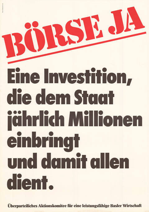 | Beschreibung der Vorlage | Der Grossratsbeschluss betraf eine Ausgabe von 19,1 Millionen Franken für den Kauf von Mieteigentum, den Umbau und die Einrichtung der Börse am Aeschenplatz. Die Börse hatte ihren Standort bisher an der Schifflände (s. Abstimmung vom 4.9.1904), litt dort aber unter Platznot. Die Liegenschaft am Aeschenplatz 7 gehörte bisher der Basler Versicherung (Bâloise), sie stand kurz vor dem Umzug in neue Gebäude am Aeschengraben. Mit grösseren und modernen Räumlichkeiten für die Börse verbunden war die Hoffnung, dass der Wertpapierhandel nicht nach Zürich oder Genf abwandert. Die linken gegnerischen Stimmen kritisierten ein «Geschenk» an die reichen Grossbanken, und ein Komitee für gesunde Staatsfinanzen fand, dass ein Umbau am bisherigen Standort wesentlich billiger käme. |