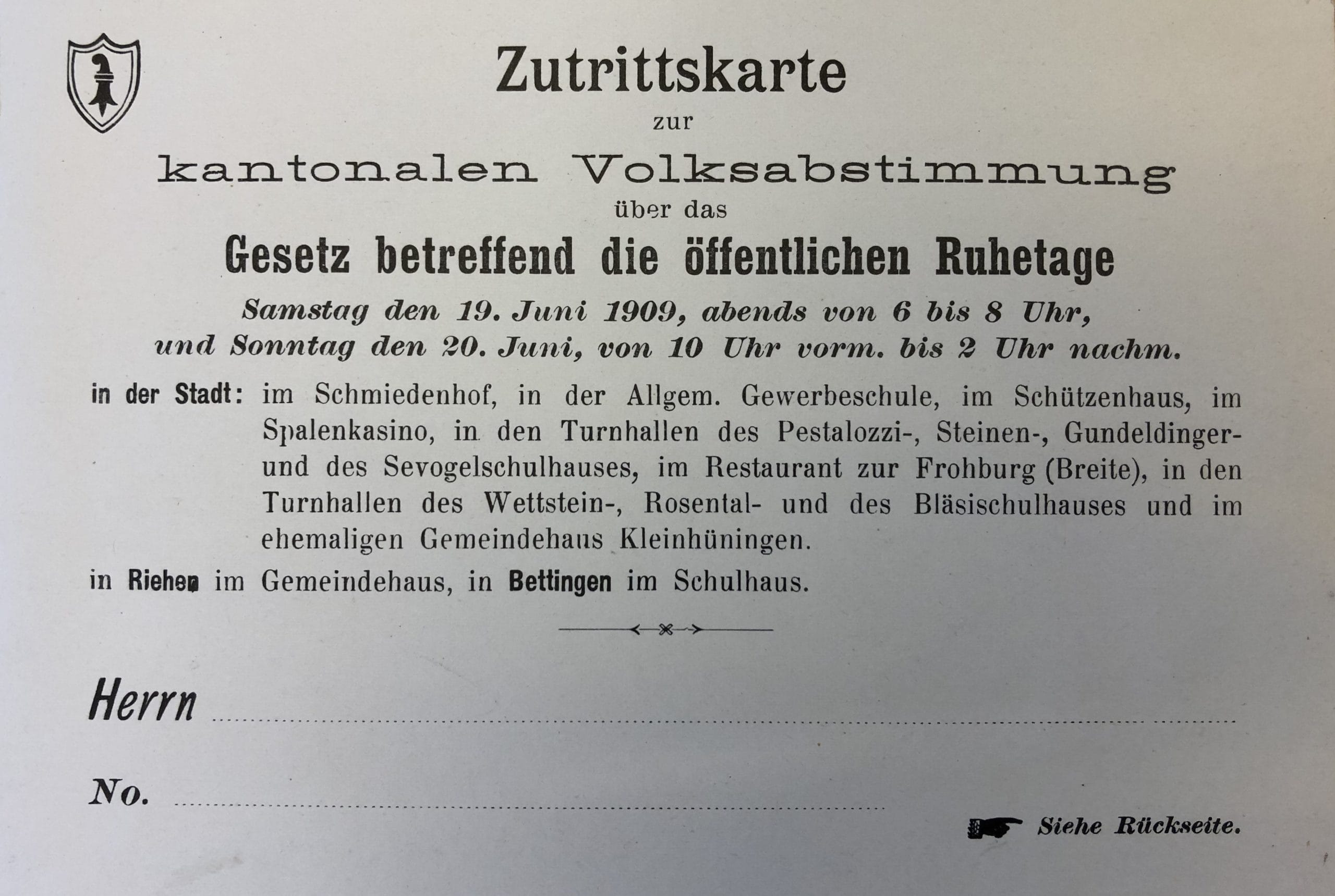 | Beschreibung der Vorlage | Die Änderung des Ruhetaggesetzes brachte den Ausbau der Sonntagsruhe für diverse Berufsgruppen, etwa Dienstboten und Gärtner, kaufmännisch Angestellte, Coiffeure und Bäcker. Coiffeurgeschäfte mussten am Sonntag schliessen und auch die sonntägliche Arbeit in kaufmännischen Betrieben wurde untersagt. |