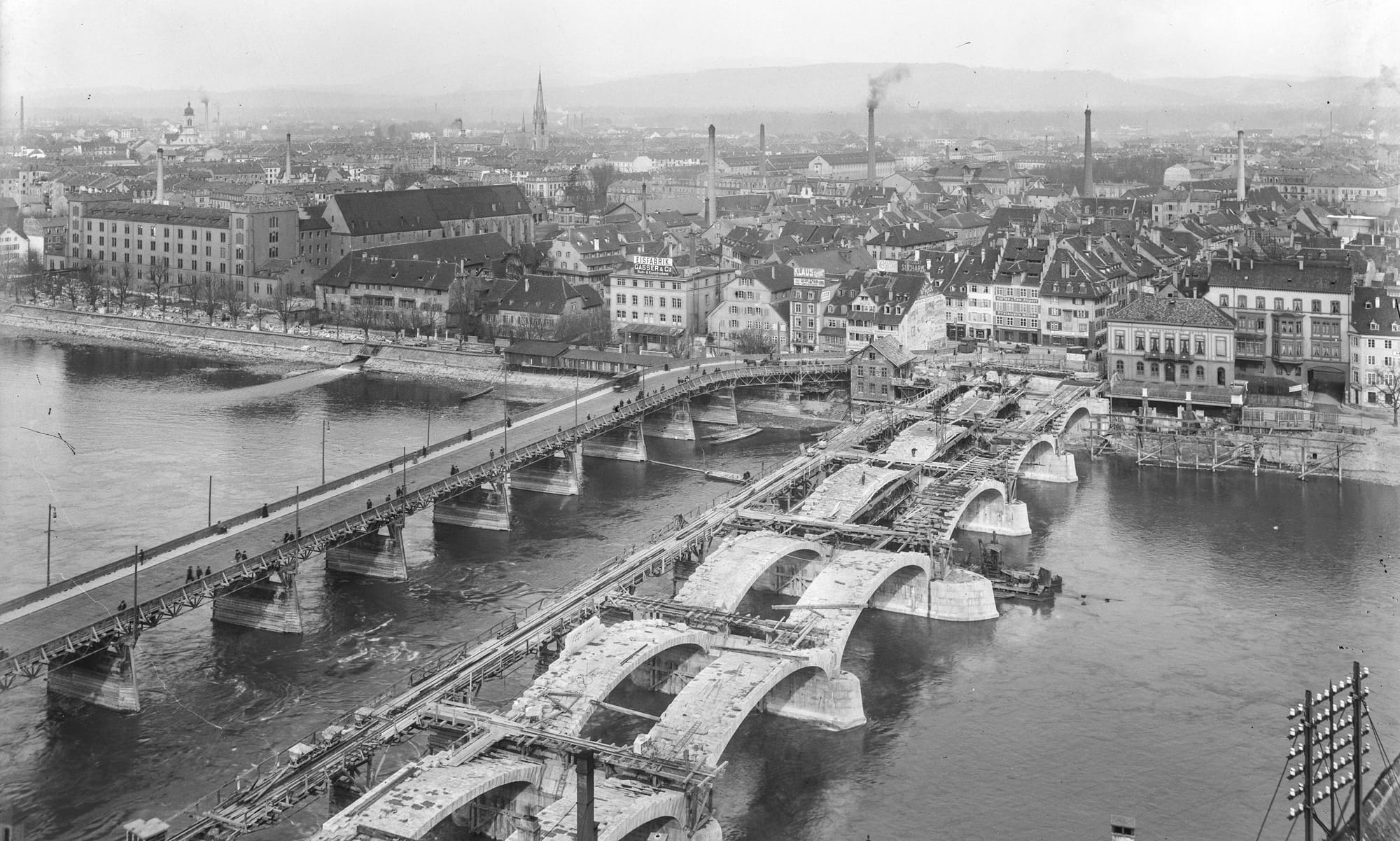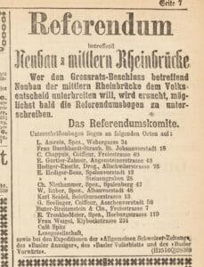 | Beschreibung der Vorlage | Der Grossratsbeschluss betraf den Bau einer neuen mittleren Rheinbrücke. Sie sollte an die Stelle der bestehenden Brücke kommen und von 12,6 auf 18 Meter verbreitert werden. Teil des Beschlusses bildete auch die Birsigkorrektion vom Fischmarkt bis zum Rhein und die Korrektion der anstossenden Strassen. Die alte Brücke waren in schlechtem Zustand, sie konnte die neue Last des Trams kaum tragen. Zu einem Ersatz gab es jedoch diverse Ideen: etwa die Verlegung der Brücke rheinabwärts oder eine zweite Parallelbrücke. Kritikpunkt bildeten auch die hohen Kosten und die ungenügende Kostenschätzung des Regierungsrats. Zur Gegnerschaft hinzu kamen konservative Kreise, welche an der alten Brücke festhalten wollten. |