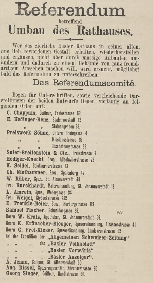 Der Grossratsbeschluss betraf den Umbau und die Erweiterung des Rathauses, um Platz für die Verwaltung zu schaffen. Zudem sollte das Rathaus einen repräsentativen Turm erhalten, denn nach der Vergrösserung des Marktplatzes hatte das Rathaus an städtebaulicher Ausstrahlung verloren. Die Opposition richtete sich gegen die Veränderung des altehrwürdigen Rathauses von 1514 und den Turm «von aufdringlicher Gestalt».